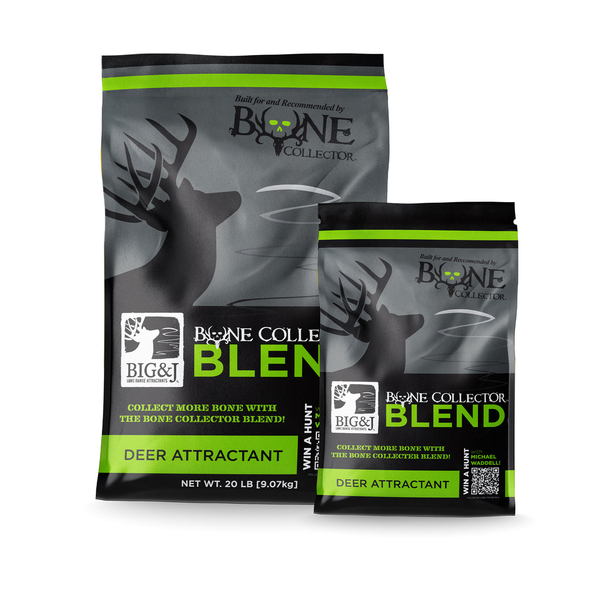 Bone Collector Blend is an amazing attraction with three irresistible grains with the special aromas Big&J® is known for.  In this era of food plots and property management, deer will choose to go to the setup that’s best. Bone Collector Blend is your secret weapon. Its powerful aroma, the result of a proprietary refining process, draws deer from farther away. But Bone Collector Blend is not just an attractant.  In fact, it has a TDN (total digestible nutrition) level that is higher than virtually all premium feeds, and a high level of protein. This brings the big bucks out and keeps deer coming back all season long.  With a proprietary secret attractant, protein content, fat content, and molasses to bring deer to you and keep them on your property.  Supercharge your feed site with the attractant power of Bone Collector Blend.  Pour it on the ground or blend in with other feeds to give the area the attracting aroma and taste that Big&J® is known for.