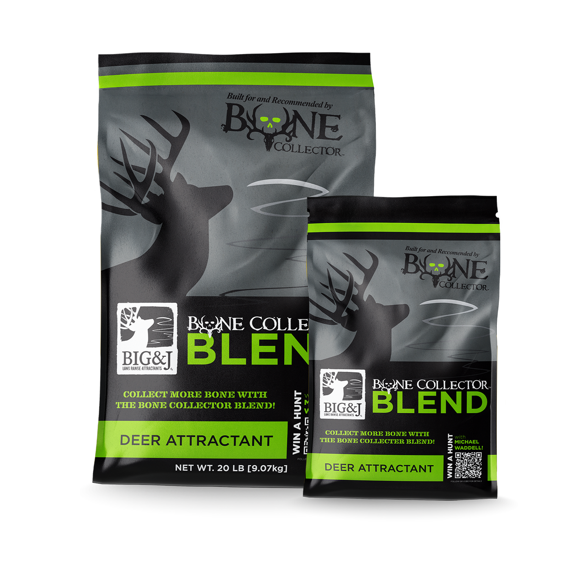 At Bone Collector, we like to use products that work and we have used about everything available to hunters. For the last several years we have used Big&J® because the results don’t lie. We see more deer in front of game cameras and at stands, have consistent growth in our bucks and our herd as a whole, and consistently have opportunities to harvest the deer we are chasing. We’ve partnered with Big&J® to develop the BONE COLLECTOR BLEND to help hunters kill more deer every year. Collect more bone with the Bone Collector Blend!